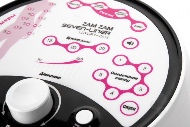 Seven Liner Zam-Luxury – это пневмокомпрессионный аппарат для массажа, лимфодренажа и прессотерапии ног, рук и талии. Аппарат имеет три основных режима работы: активный массаж, лимфодренаж, прессотерапия. Устройство полностью русифицировано, все кнопки подписаны. Манжеты аппарата имеют скрытые шланги для удобства пользователей. В отличие от аналогов, в манжетах Zam-Luxury по пять камер, следовательно, массаж получается более плавным и качественным. Также Zam-Luxury имеет кнопку быстрого спуска воздуха из манжет. Компрессор устройства способен нагнетать давление до 265 миллиметров ртутного столба. Самой важной отличительной особенностью аппарата является наличие голосового информатора, который комментирует все манипуляции, проведенные с устройством. Это актуально для слабовидящих людей. Zam-Luxury рекомендован к применению в домашних условиях, а также для использования в косметических кабинетах и салонах красоты.